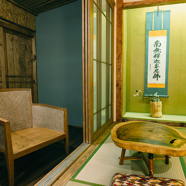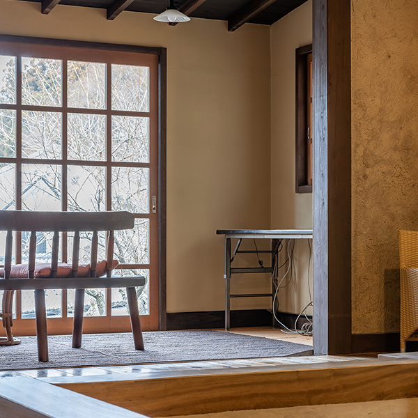 静寂と開放感に包まれる、2〜4名様でご利用いただける特別室です。 高さ6mの大きな窓からは黒川の豊かな自然を望み、まるで森の中に佇むような没入感をお楽しみいただけます。